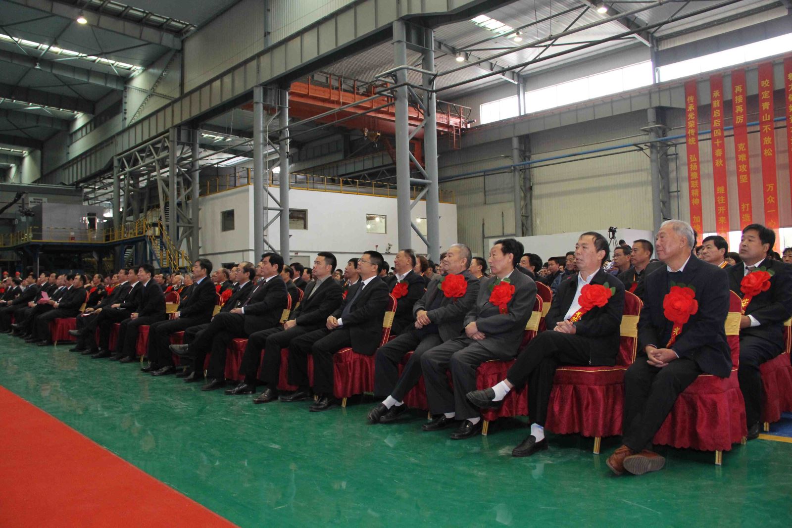 在煥然一新的高精鋁冷軋車間門前,100余家合作單位的祝賀條幅垂直懸掛在廠房前方,代表著社會(huì)各界的良好祝愿。慶典大會(huì)現(xiàn)場(chǎng)喜慶熱烈,“誠(chéng)信為本,一體雙翼,譜四十華章員工安居樂(lè)業(yè);創(chuàng)新發(fā)展,轉(zhuǎn)型升級(jí),追百年夢(mèng)想豫聯(lián)基業(yè)長(zhǎng)青”的大幅對(duì)聯(lián)熠熠生輝。