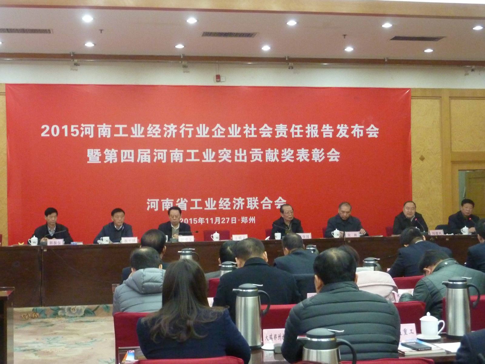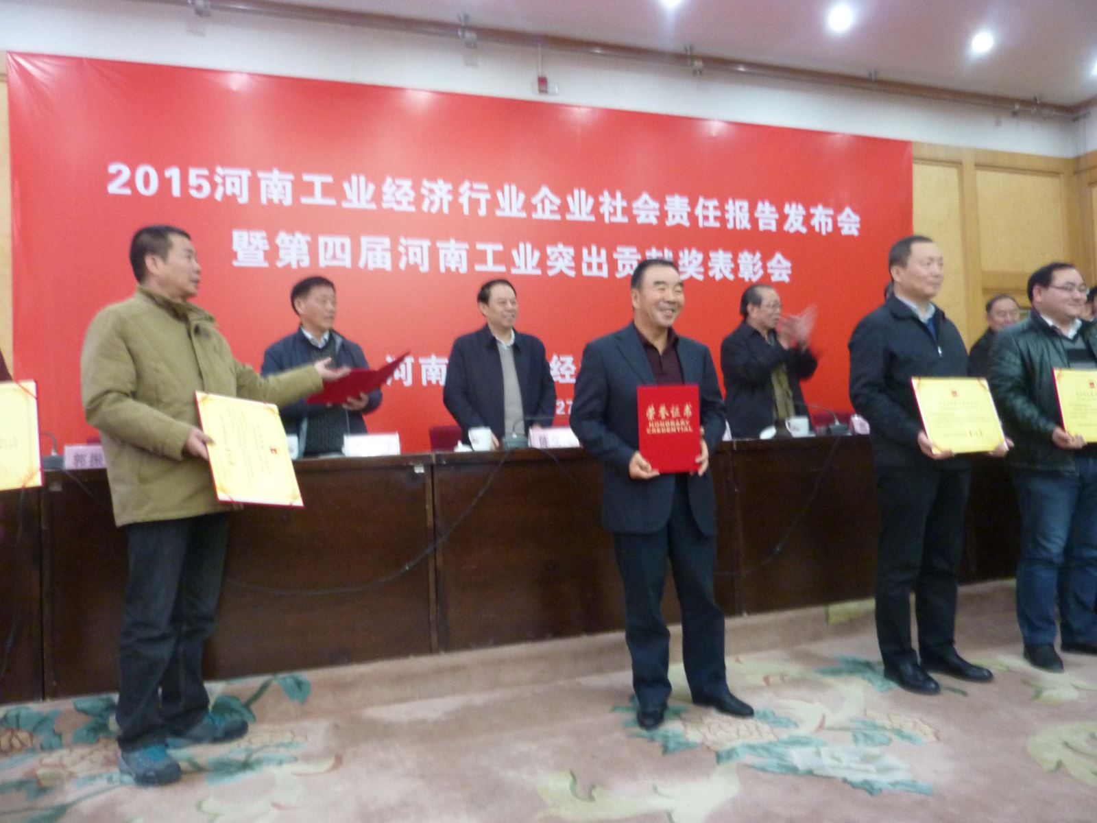11月27日上午,2015河南工業經濟行業社會責任報告發布會暨第四屆河南工業突出貢獻獎表彰會在省人民大會堂召開。會議發布了行業企業社會責任報告,表彰了第四屆河南工業突出貢獻企業和企業家,展示了行業協會調研成果。省委、省人大、省政府、省政協有關部門領導及省發改委、工信委、民政廳、國資委、省政府發展研究中心等有關政府部門領導及省社科院領導出席會議,河南省工業經濟聯合會會長王明義出席會議并講話。 豫聯集團榮獲“第四屆河南工業突出貢獻獎”,張洪恩董事長榮獲“第四屆河南工業突出貢獻企業家”榮譽稱號。張洪恩董事長受邀出席會議并發布豫聯集團社會責任報告。