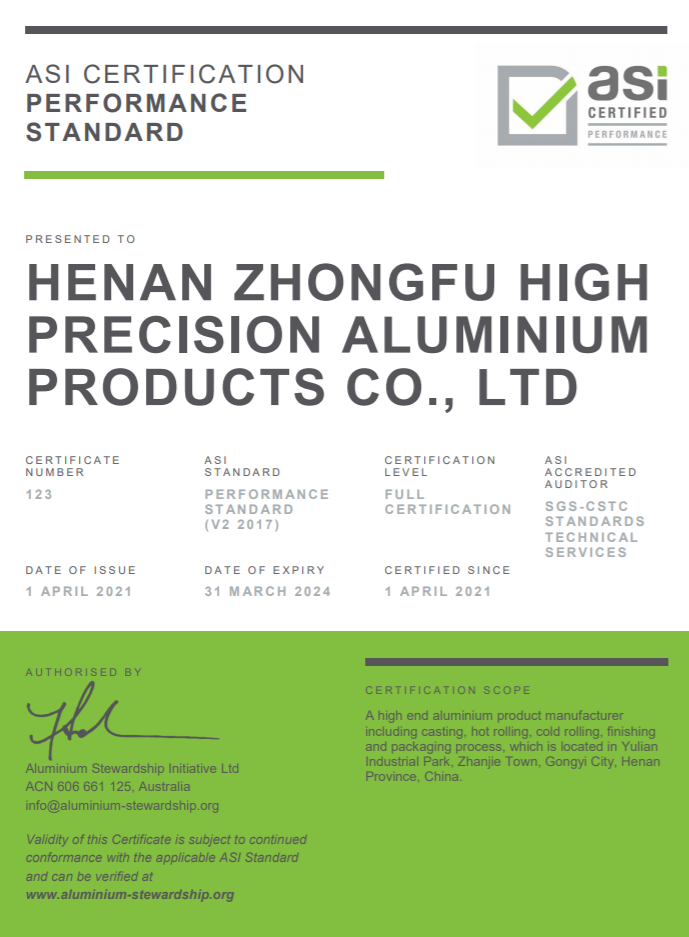 4月21日,中孚高精鋁材公司成功通過鋁業管理倡議(ASI)績效標準認證,踐行了企業對鋁的負責任生產、采購和管理等方面的承諾。