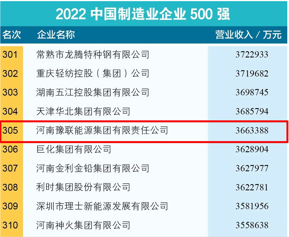 豫聯(lián)集團(tuán)上榜“2022中國(guó)制造業(yè)企業(yè)500強(qiáng)”