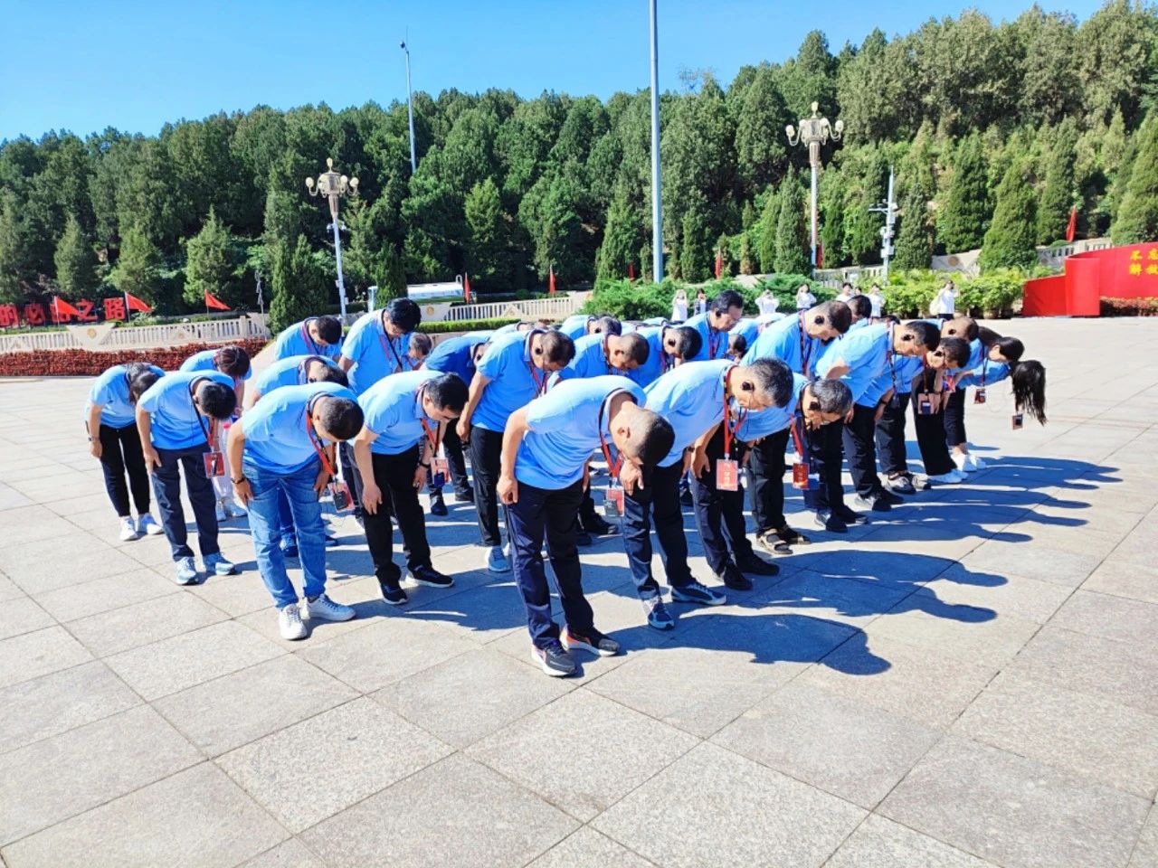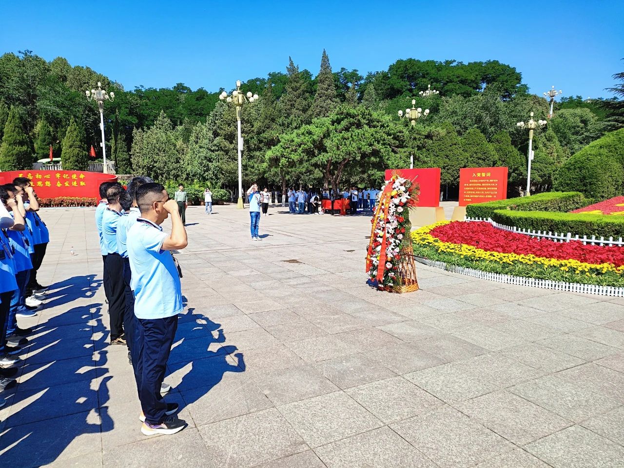 在西柏坡紀念館廣場上,大家向五大書記銅像敬獻花籃,行鞠躬禮,表達了對老一輩無產階級革命家的崇高敬意和深切緬懷之情。面對鮮紅的黨旗,大家高舉右拳重溫了入黨誓詞。