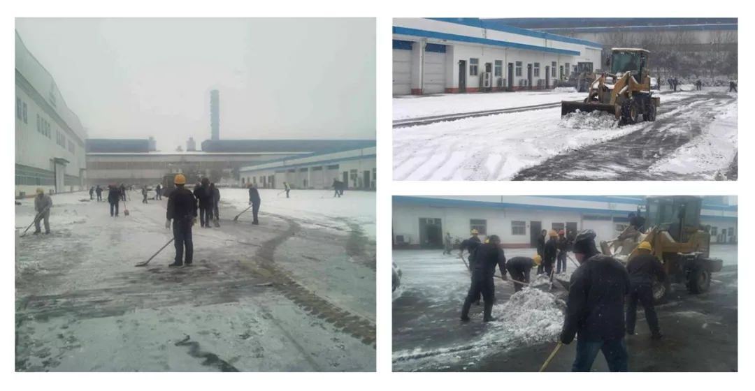 1月3日下午生產調度會上,銀湖鋁合金公司提前安排極端天氣應對措施。1月4日一大早,公司干部員工不顧雪花紛紛、寒氣陣陣,揮舞著鐵锨、掃帚,在鏟車的配合下,奮力清掃廣場及運輸道路積雪,保證正常生產作業秩序。
