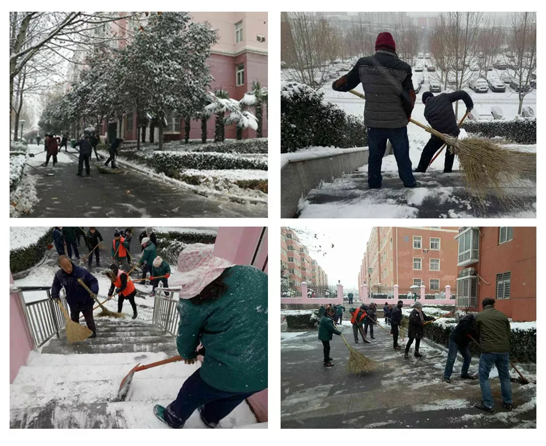 4日早上,園區物業公司全員出動,全力清掃積雪。由于雪一直不停地下,剛剛掃過的路面很快又被雪覆蓋,大家反復清掃,確保道路暢通。